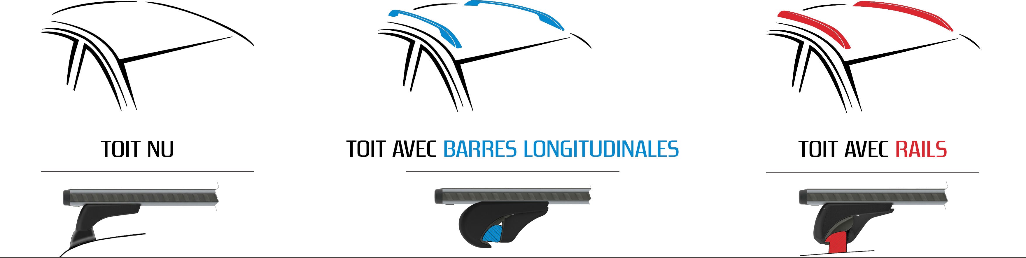 Notre catalogue couvre tous les systèmes de fixation : toit nu, barres longitudinales ouvertes, rails intégrés ou points de fixation. Chaque gamme est conçue pour offrir une installation précise, une excellente stabilité et une compatibilité parfaite avec votre véhicule. Vous trouverez des barres en aluminium (légères, silencieuses, esthétiques) ou en acier (robustes et économiques).